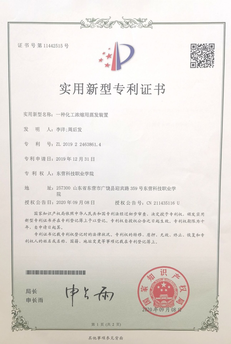 我院2018级工业分析技术班李洋同学,石油化工技术班周后发同学发明的“一种化工浓缩用蒸发装置”得到了国家知识产权局颁发的实用新型专利证书。该专利自去年12月31日申请,历时半年多的审核,于今年9月8日正式授权公告。这也是能源工程学院以学生作为专利权人获得的首例实用新型专利,彰显了能源工程学院创新型、高素质技术技能型人才培养的质量和成效。