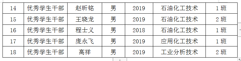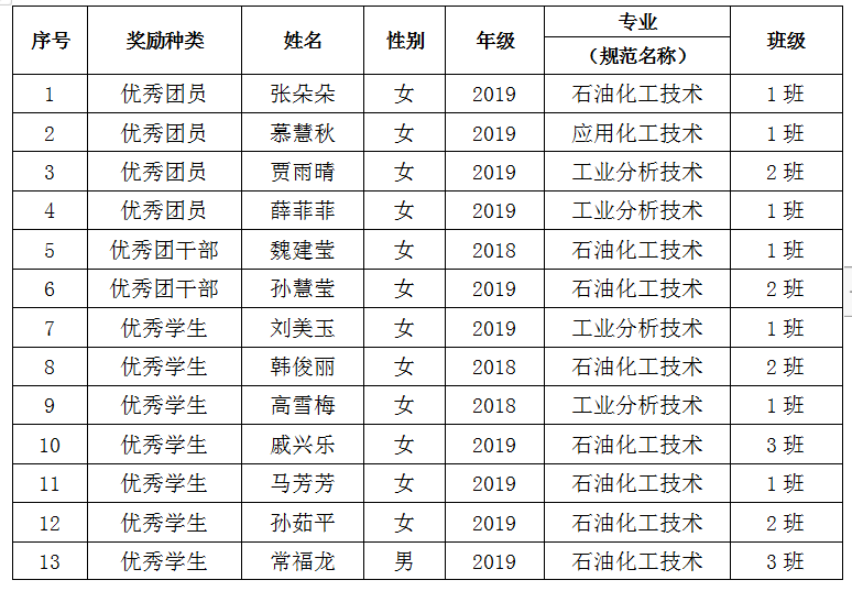 为了促进我院学生德智体美全面发展,表彰先进,树立典型,鼓舞和激励广大学生勤奋学习,我院于上周开展了能源工程学院2019年度评优评先工作,经过班级推荐、学院初审、学院公示,张朵朵等18名同学被评为2019年度优秀个人(详细奖励种类见下表);2019级石油化工技术1班被评为2019年度先进班集体、2019级石油化工技术2班团支部被评为优秀2019年度优秀团支部,现予以通报表扬。