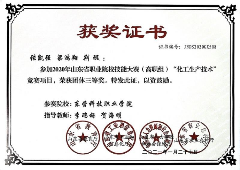 化工生产技术赛项是职业院校石油和化工及相关专业的核心技能大赛之一,全国职业院校技能大赛,是教育部发起并牵头,联合国务院有关部门以及有关行业、人民团体、学术团体和地方共同举办的一项公益性、全国性职业院校学生综合技能竞赛活动。山东省自2018年以来已经连续举办四届,我院代表队在山东省高职院校技能大赛“化工生产技术”赛项中连续三年获得佳绩。