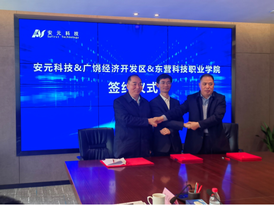 在南京安元科技有限公司,王三明董事长详细介绍了公司作为国家级专精特新“小巨人”企业,专注于“工业互联网+危化品安全生产”智慧改造与建设方面的服务能力及取得的成就。随后,广饶经开区管委会、bw必威西汉姆联、安元科技股份有限公司三方共同签署协议,合作共建实训基地,打造产教联合体,服务周边区域经济发展,协同推进化工、应急行业人才培养、职业培训、技术研发服务、成果转移转化推广。
